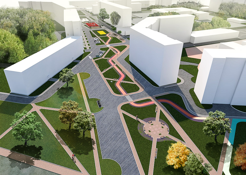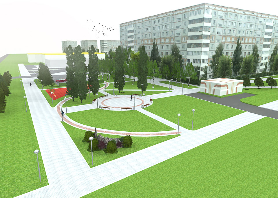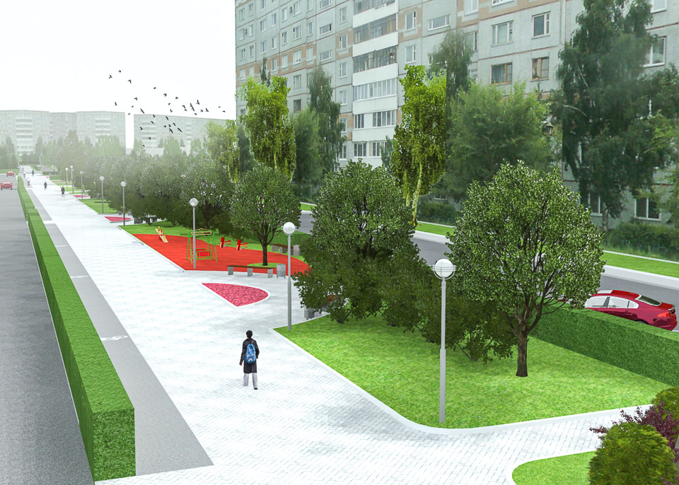 Привести в порядок тротуары и пешеходные дорожки, правильно, с учетом реальных потребностей горожан разместить игровые и спортивные площадки, поставить лавочки и урны, проложить велодорожку, восстановить газоны и разбить цветники, придумать, как грамотно разместить мини-площадки для спокойного отдыха, посадить деревья — и не «прутики», а полноценные крупномеры: в дизайн-проекте архитектор использовал «тактику малых дел», чтобы добиться максимального результата — создать пример по-настоящему комфортной городской среды в Комсомольском городке.