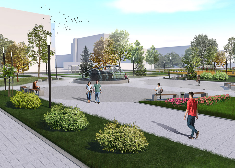 Общественное пространство в границах улиц Гуртьева и 14-й Чередовой планируется условно разбить на три функциональных зоны. Это главная площадь, доминантой которой станет фонтан, он выполнен в виде минималистической скульптуры из натурального камня и металла. Площадь предназначена для проведения различных мероприятий. Специально для детей предусмотрена игровая площадка. А ближе к мемориалу планируется зона тихого отдыха.