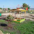 В центре двора установлен современный детский многофункциональный игровой комплекс и деревянная песочница. От дома к игровой площадке ведет дорожка, выложенная плиткой. За комплексом разбиты четыре большие клумбы различной геометрической формы, установлены бетонные вазоны с цветами и девять металлических конструкций (в виде конусов, цилиндров и шаров), оплетенных лианами из вьюнов. В этом же дворе можно найти клумбу, повторяющую цветовое решение флага Российской Федерации.