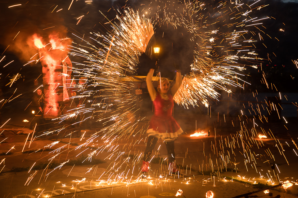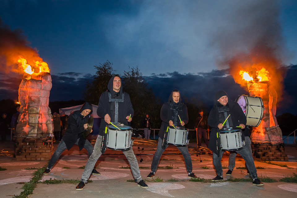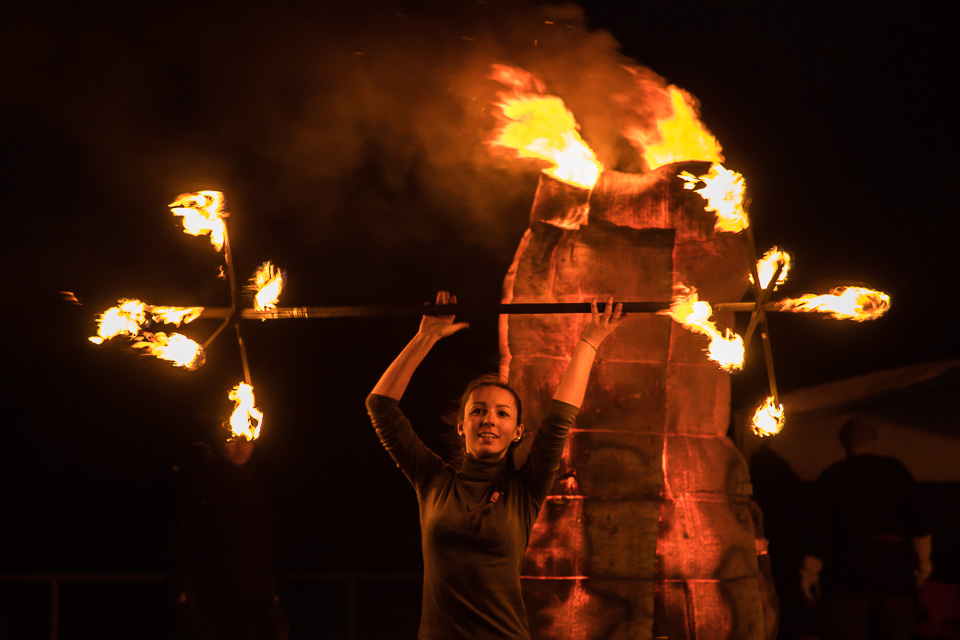 Пока скульптуры скрыты от глаз зрителей, стартует огненное шоу