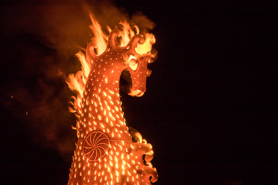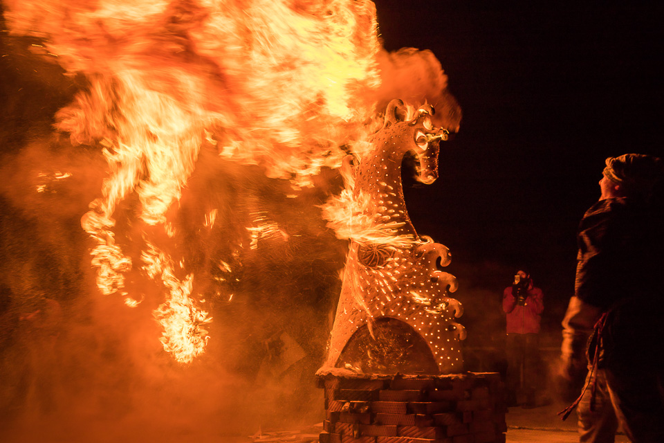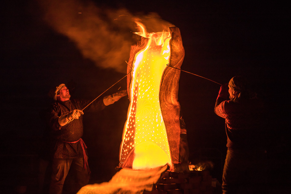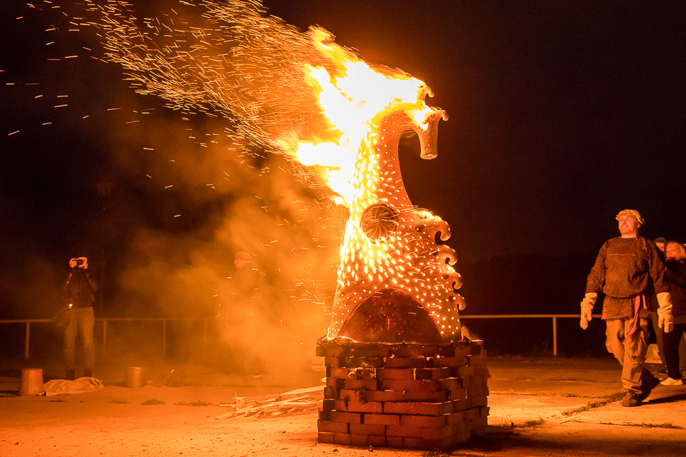Целую неделю мастера трудились над двухметровыми анималистическими скульптурами, чтобы воскресным вечером эффектно обжечь их открытым способом на глазах изумленной публики.