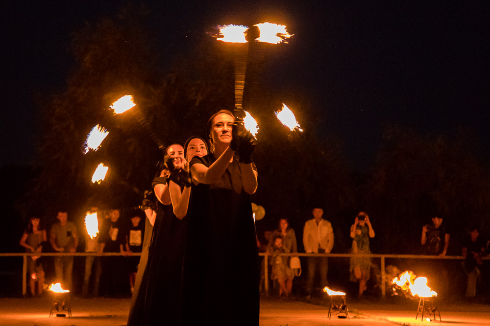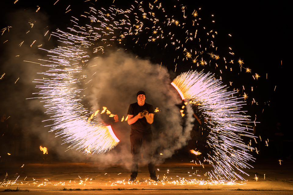 Вращение огненных предметов на большой скорости сразу покоряет публику