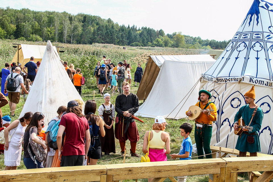 Добро пожаловать на фестиваль! На поляне в парке Победы раскинулись шатры лагеря живой истории Музыканты встречают гостей мелодиями ушедших столетий