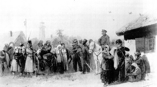 Этап ссыльных женок на казачьей линии. Рисунок Н.Н. Каразина