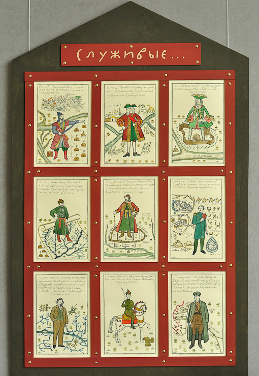 Сергей Александров, 1955 г. р. Служивые…, 2015. Картон, фанера, гелевая ручка, акварель, маркер, декоративные гвозди, темпера; 122×75. Второе место в категории «Графика»