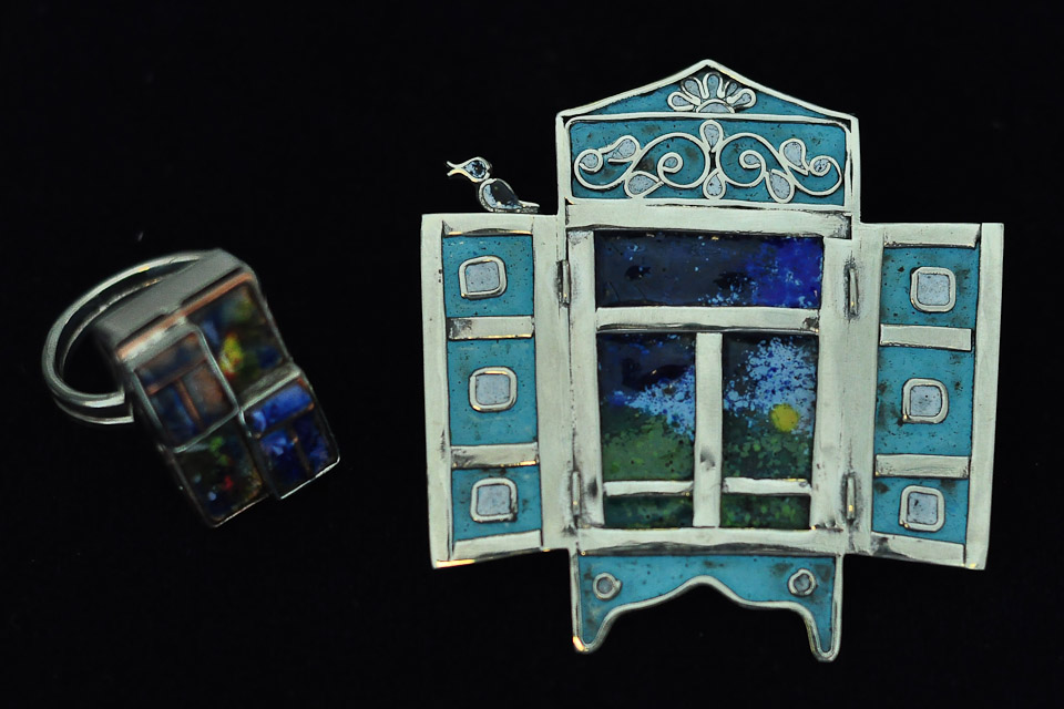 Ольга Крышковец, 1950 г. р. Гарнитур «Зажигает окна вечер синий, лунным светом серебрит листву». Т. Четверикова. 2015. Мельхиор, медь, эмаль. Брошь 5,3×5,5; кольцо 2,3×1,5. Первое место в категории «Декоративно-прикладное искусство»