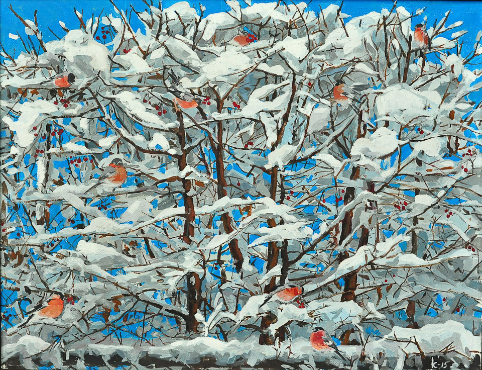 Святослав Капралов, 1991 г.р. Снегири. 2015. Картон, масло; 70×90. Специальный приз жюри «Дебют»