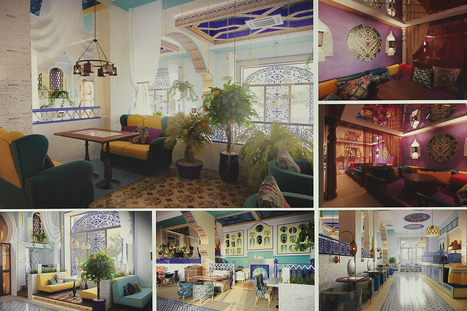 Ирина Мордвинова, 1963 г. р. Концепт-проект ресторана «Хоттабыч». 2015. Планшет, цифровая печать; 150×100. Первое место в категории «Средовой дизайн»