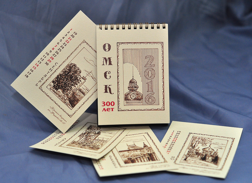Маргарита Фёдорова, 1939 г. р. Календарь перекидной «Омск-300». 2015. Бумага, эскиз: ручка, печать;14,7×10,5. Третье место в категории «Полиграфический дизайн»
