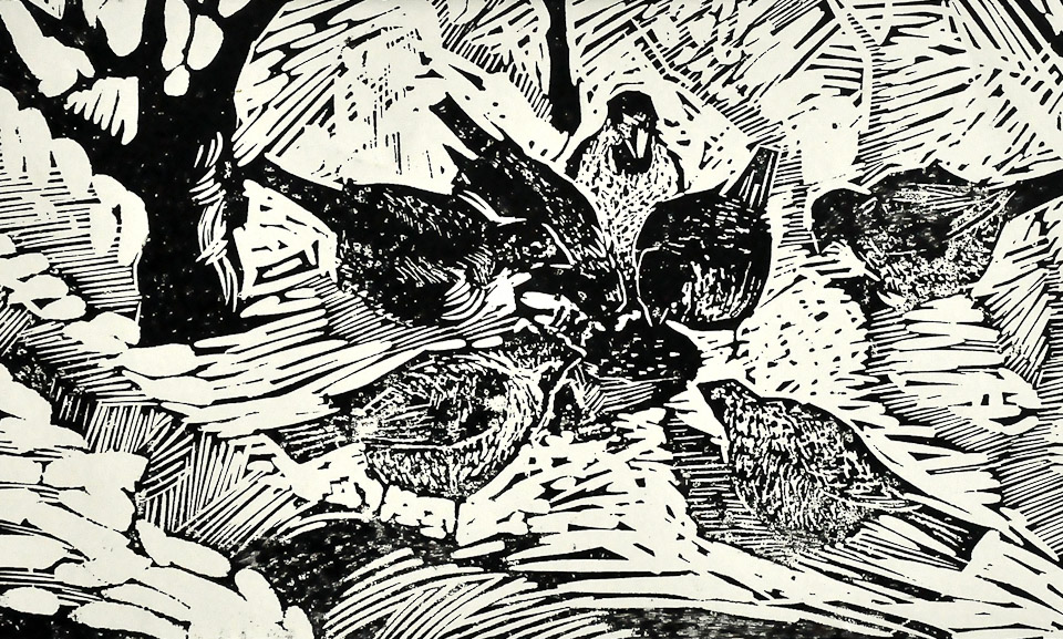 Иван Желиостов (1936 г.р.). Воробьишки. 1966. Бумага, линогравюра