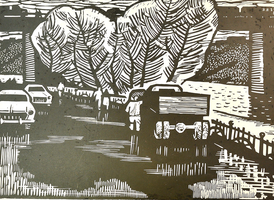 Анатолий Чермошенцев. У моста. 1964. Бумага, линогравюра