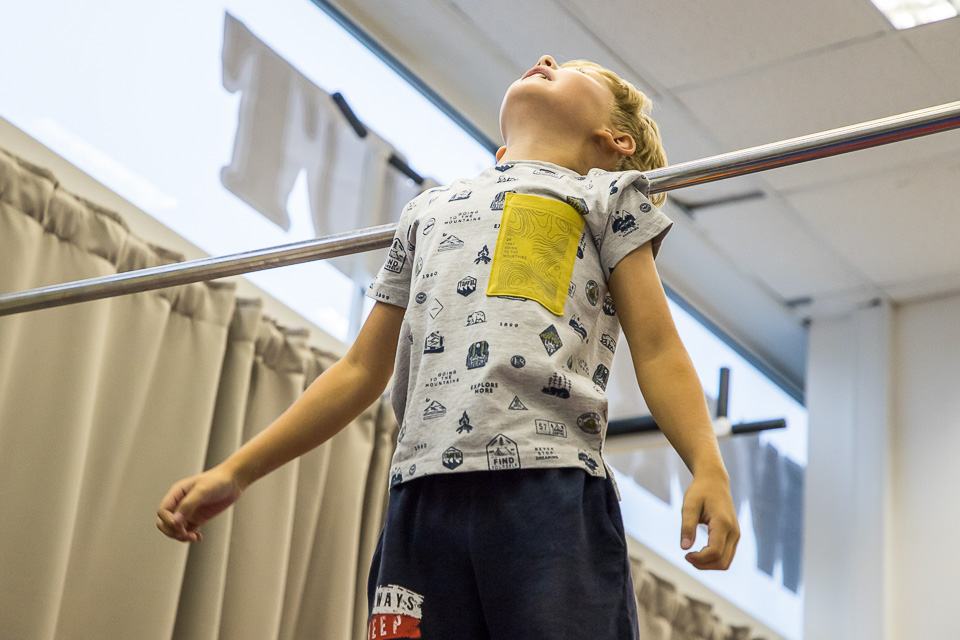 Самому маленькому участнику нужна помощь, чтобы оказаться на перекладине