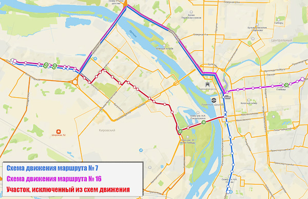 Маршрут № 16: пос. Солнечный — ул. Дианова — ул. Лукашевича — мост им. 60 лет ВЛКСМ — ул. Красный Путь — ул. Интернациональная — ул. Гагарина — Комсомольский мост — ул. 10 лет Октября — завод им. Попова.
