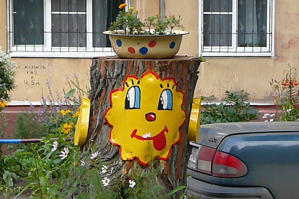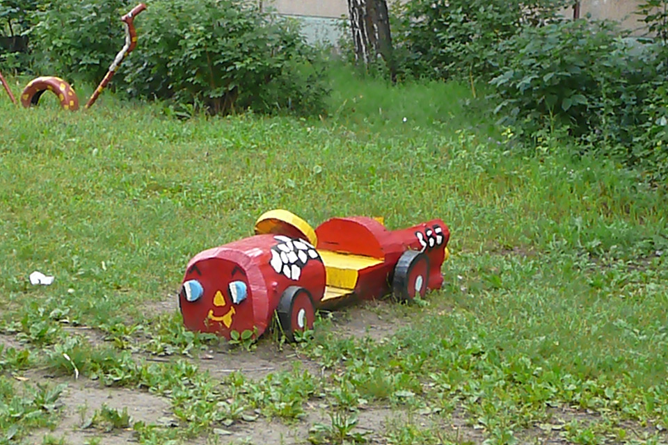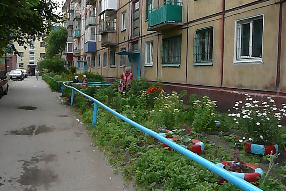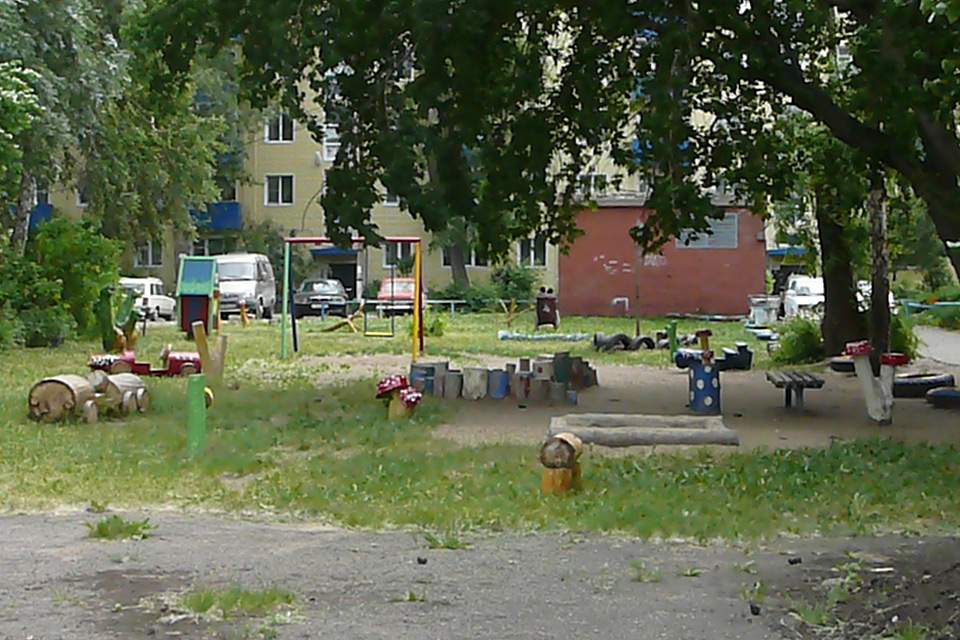 Сначала провели субботник: очистили двор от мусора, подстригли кусты, разбили цветники, позже из бревен соорудили беговую дорожку, песочницу, фигуры зверей. Вокруг дома высадили семь пирамидальных тополей.