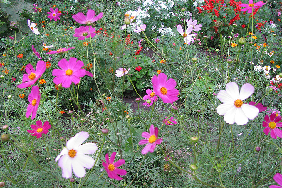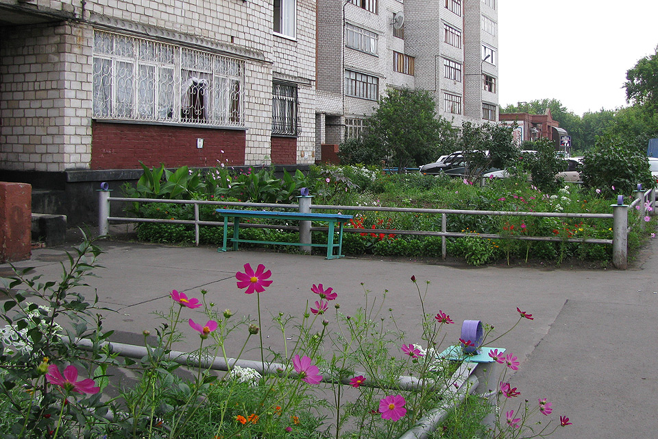 Богатый цветник под окнами дарит хорошее настроение всем жителям дома.
