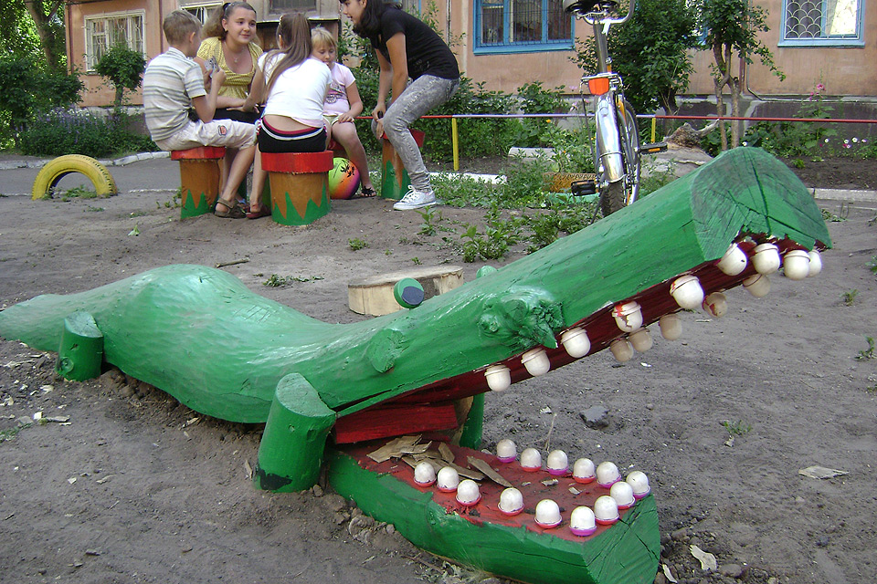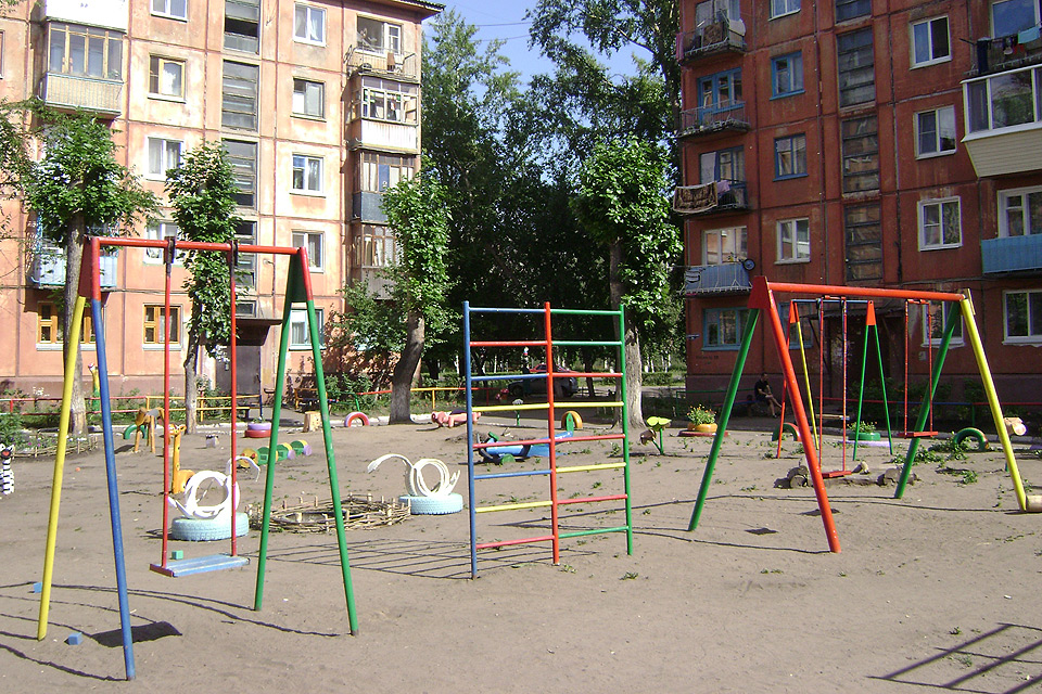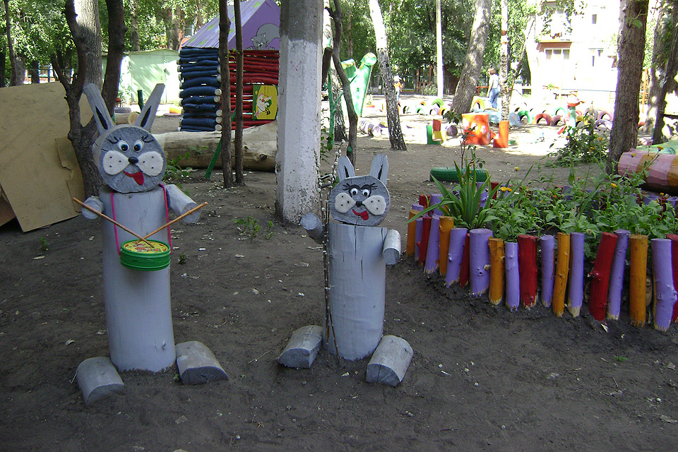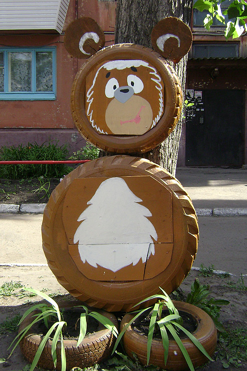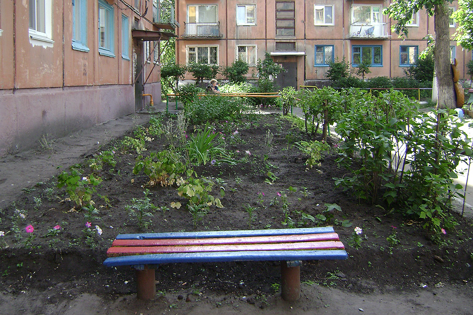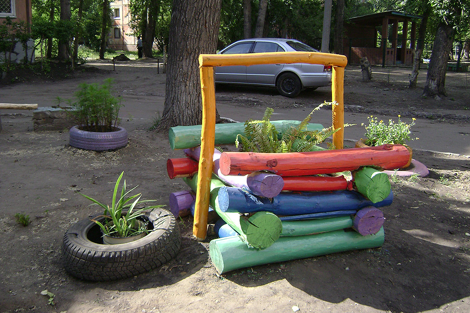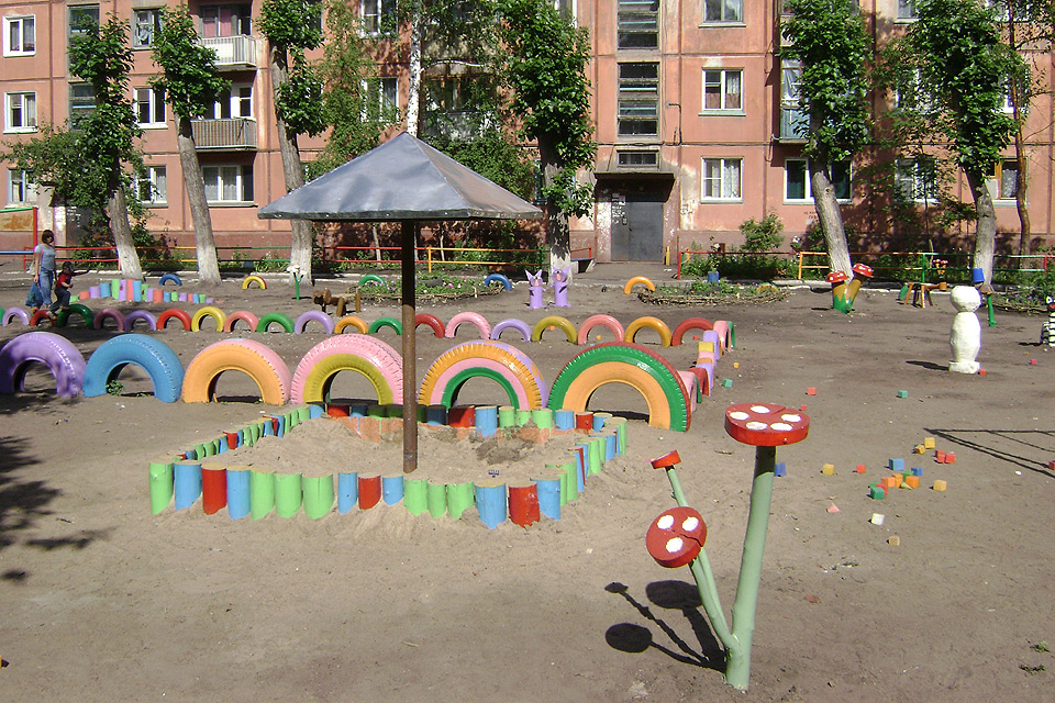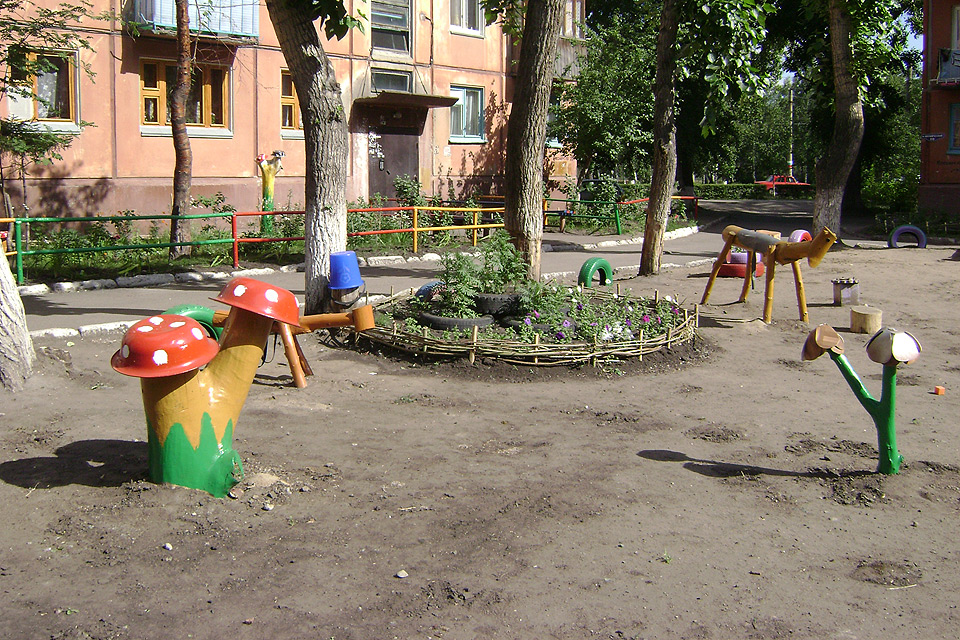 С фантазией подошли жители Космического проспекта к благоустройству своего двора, превратив его в яркий и красочный островок детства.