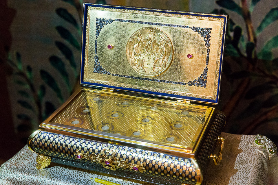 На ларе — таблички: частица камня от гроба Пресвятой Богородицы, святого апостола Андрея Первозванного, святой блаженной Матроны Московской, святого апостола Иакова брата Господня, святителя Тихона патриарха Московского…