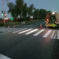 Накануне ночью специалисты организации-подрядчика ИП Майоров «рисовали» продольную горизонтальную разметку на проспекте Королева от ул. Заозерной в направлении ул. Химиков. Параллельно рабочие участка «Транссигнал» наносили разметку в местах пешеходных переходов на ул. Дианова и 22 Декабря.