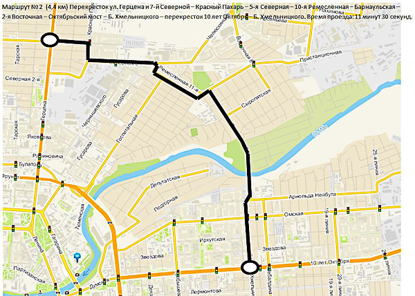 Второй маршрут, протяженностью 4,4 км, был построен по улицам Герцена, Красный Пахарь, 5-я Северная, 10-я Ремесленная, Барнаульская, 2-я Восточная, Октябрьский мост, Богдана Хмельницкого. Время проезда второго маршрута составило 11 минут 30 секунд.