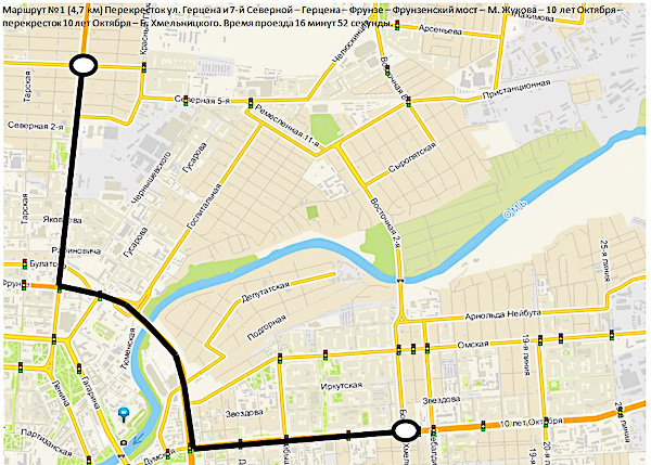В связи с частичным ограничением движения по Фрунзенскому мосту из-за проведения ремонта значительно увеличилась транспортная нагрузка на улицу Герцена. По этой причине специалистами департамента транспорта был проведен хронометраж времени проезда по двум маршрутам — через Фрунзенский мост и через Октябрьский мост. Оба маршрута начинались от пересечения улиц Герцена и 7-я Северная, и заканчивались на перекрестке улиц 10 лет Октября и Богдана Хмельницкого. Хронометраж времени проезда проводился в утреннее время.