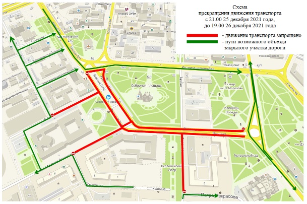 Как пояснили в департаменте общественной безопасности администрации города Омска, будет прекращено движение всех видов транспорта с 21:00 25 декабря до 19:00 26 декабря 2021 года по улице Ленина — на участке от улицы Интернациональной до площади Победы, включая Соборную площадь; по улице Ивана Алексеева — от улицы Красина до Соборной площади; по Банковскому переулку — на участке от улицы Певцова до Соборной площади; по улице Тарской — на участке от улицы Ленина до улицы Красина.