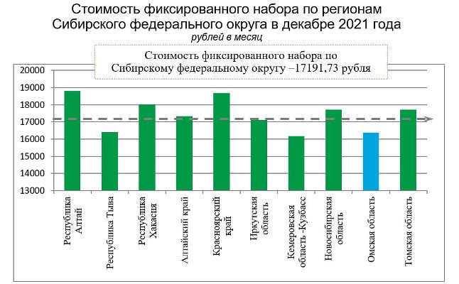 Омскстат отмечает, что стоимость фиксированного набора стабильно ниже среднего уровня по Сибирскому федеральному округу и Российской Федерации в целом. Омская область входит в число регионов Российской Федерации с минимальным значением показателя. На конец декабря 2021 года она занимала второе рейтинговое место в порядке возрастания показателя среди регионов Сибирского федерального округа. Ниже показатель только у Кемерово (16 170,55 руб.), Новосибирск расположен на 7 рейтинговом месте — 17 726,74 руб. в расчете на месяц.