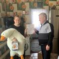 Заместитель мэра города Омска, директор департамента общественной безопасности Эдуард Ягодка подарил Полине Берниковой мягкую игрушку Гусь - обнимусь и велотренажер.