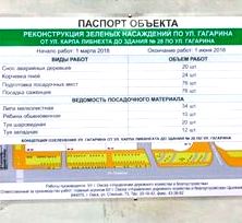 Первый «Паспорт объекта» был установлен возле госпиталя для ветеранов войн по адресу: улица Гагарина, 28. Аналогичные щиты будут устанавливать и в дальнейшем. По предварительной информации, ближайшая реконструкция зелёных насаждений будет организована на улице Химиков.