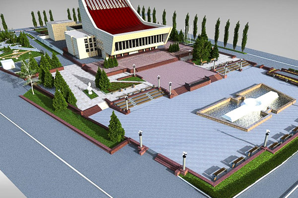 Поектировщики отказались от размещения арт-конструкции в виде информационной стелы в пользу аккуратных рекламных стендов. Их удалось поставить так, чтобы реклама не раздражала прохожих и не отвлекала от основного здания, но при этом тактично информировала театралов о предстоящих событиях. Для сохранения газона пешеходные тропинки выложат поребриками и посыплют мелким гравием, в том числе в дорожки превратят и стихийно протоптанные пути.