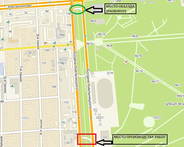 - движение автобусов маршрутов № 13, 26, 58, 119, 219 Б будет организовано по участку дороги между проезжими частями улицы Б. Хмельницкого, расположенному вблизи дома 154 по улице Б. Хмельницкого;