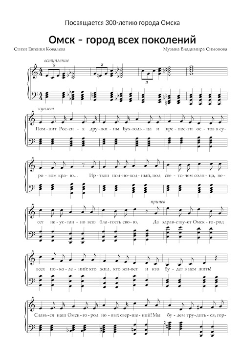К юбилею любимому городу Омску член КТОС «СибНИИСХоз» Евгений Витальевич Ковалев и композитор Владимир Васильевич Симонов подарили песню, которую они считают настоящим гимном 300-летия города Омска. Евгений Витальевич написал проникновенные слова-признания в любви к родному городу, композитор Владимир Симонов положил на эти строки музыку. Солист Омского музыкального театра Джени Окропиридзе исполнил произведение.