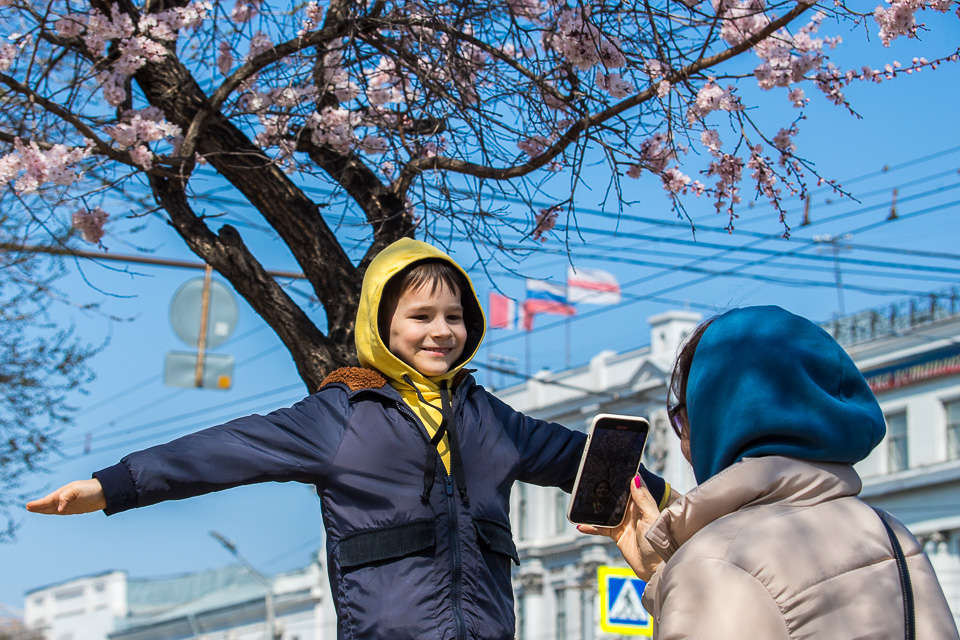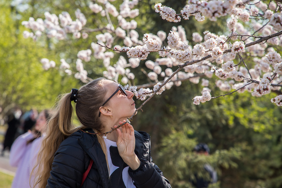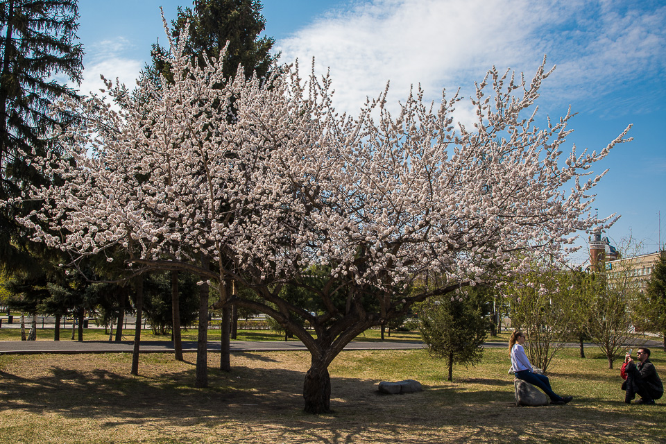 В конце апреля первым из городских плодовых деревьев зацвел абрикос. Прогуливающиеся по центру омичи не упускают возможности сделать яркие весенние фотографии, чтобы через социальные сети удивить друзей из других регионов.