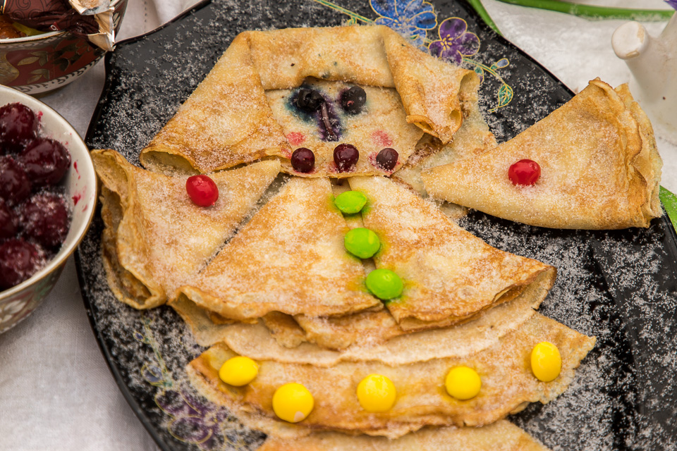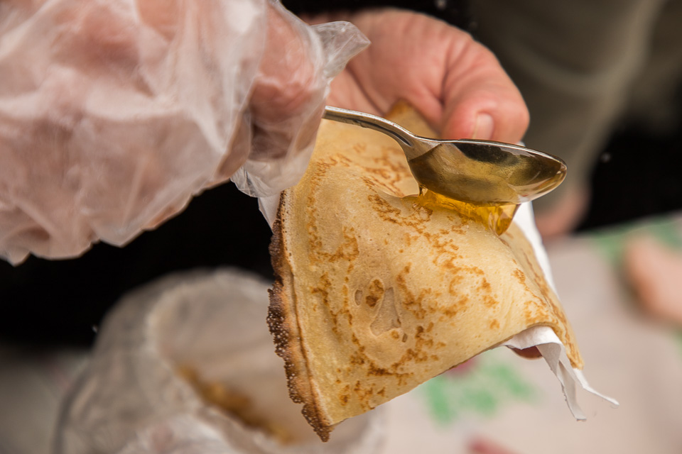 С медом, с сахаром, с маслицем — рядом со сценой есть блины на любой вкус!