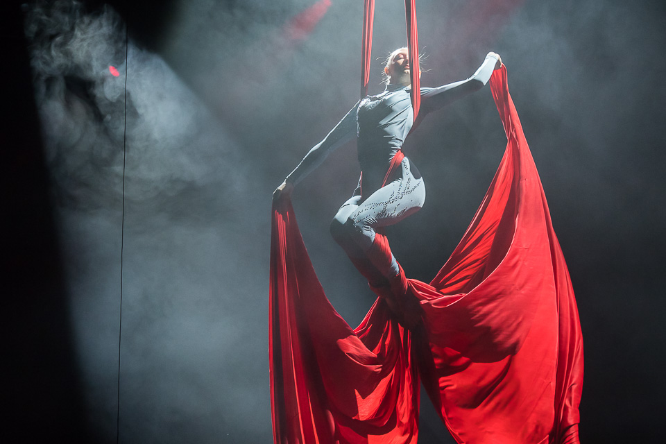 На полотнах — омская воздушная гимнастка Софья Викулова