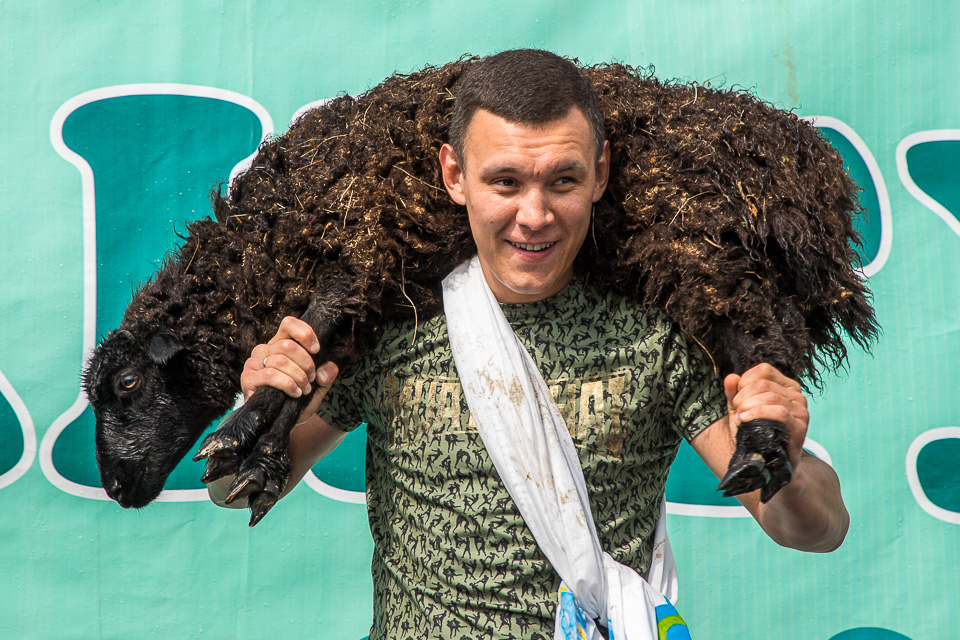 По традиции главный батыр с призовым бараном прошел круг почета по сцене