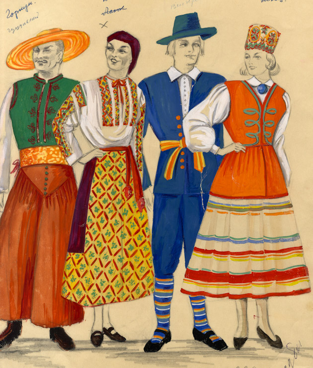В подборке, представленной вашему вниманию, — эскизы костюмов к двум спектаклям Омского театра музыкальной комедии. Это хореографическая драма в 4-х актах композитора К. Корчмарёва «Крепостная балерина, или Душенька» (1952) и оперетта на музыку украинского композитора Владлена Лукашова «Владимирская горка» (либретто Д. Шевцова, 1959).