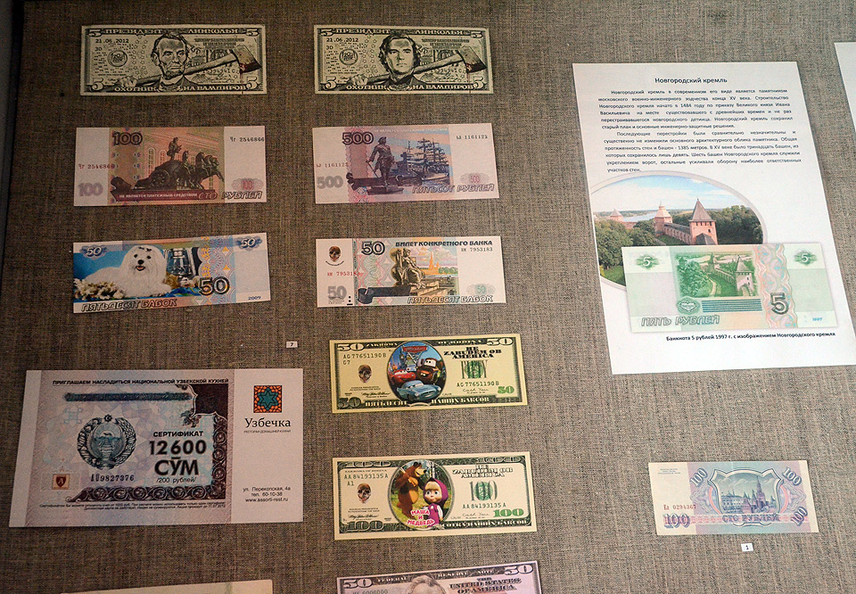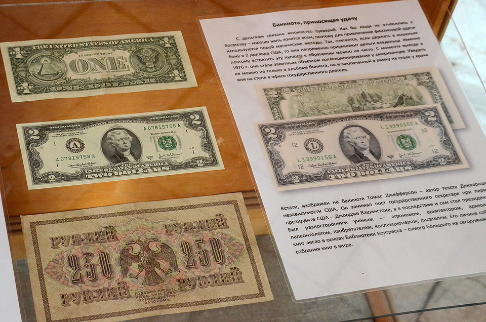 Автор экспозиции «О чём молчат деньги» — коллекционер, музейный работник из Тюмени Алексей Титов. Он составил коллекцию, с помощью которой рассказывает о символике денежных знаков, их художественном оформлении, исторических, архитектурных и мифологических образах, запечатлённых на купюрах и монетах.