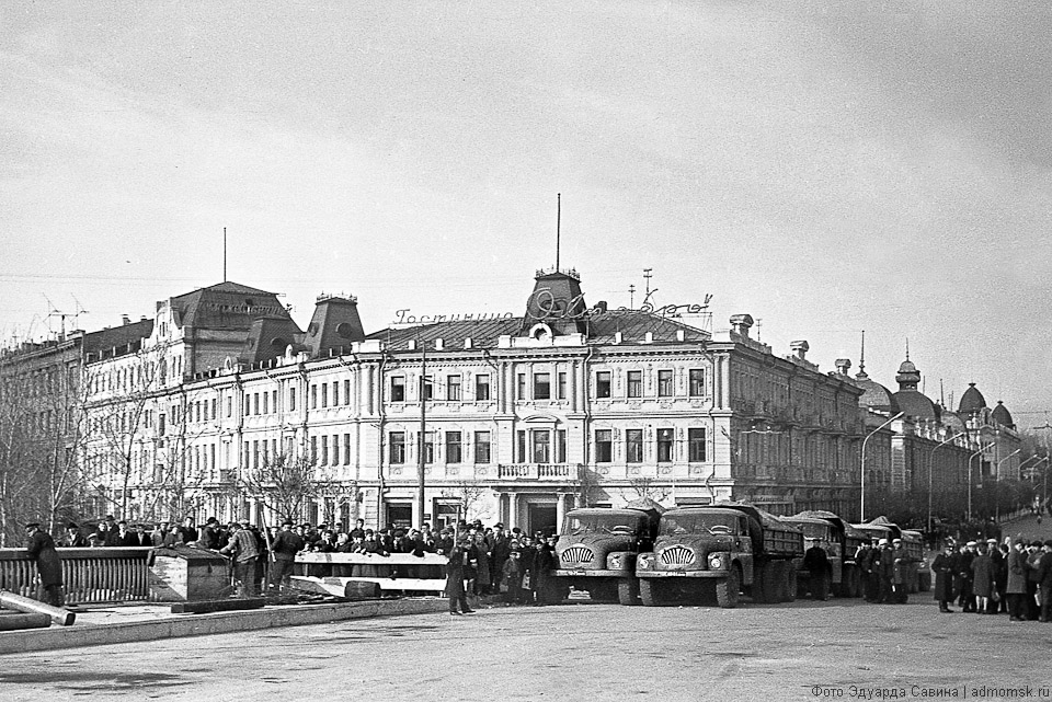 На снимках — узнаваемая центральная часть города. Сегодня мы не досчитаемся многих объектов, сохранённых на чёрно-белой плёнке: памятников деревянной архитектуры, кирпичных построек начала XX века, сотен деревьев вдоль городских улиц и в скверах. Но ключевые объекты городской среды всё те же: две реки, мосты, проспекты, «сталинки» на Ленинградской площади, старинный Любинский, пожарная каланча, омские фонтаны…
