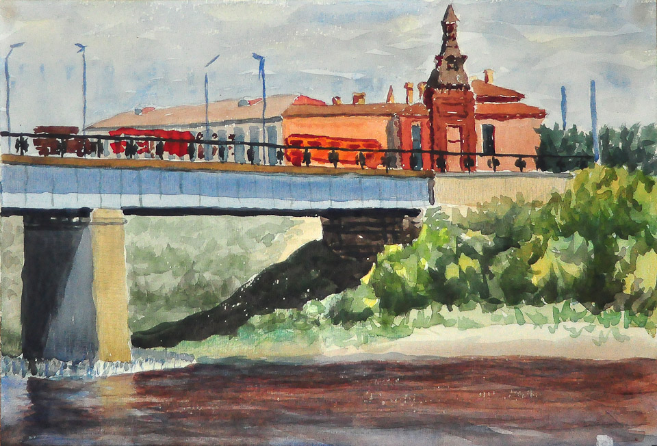 Павел Абрамов. Последний трамвай. 1995. Бумага, меццо-тинто Геймран Баймуханов.  Полдень на Куйбышева. 2001. Холст, масло Василий Белан. Железный мост. 1963. Бумага, акварель