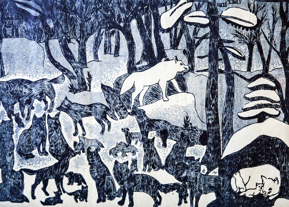 Юлия Козлова, 14 лет. Стая белого волка. Гравюра на картоне. Педагог Л.С. Петелина (ДХШ № 1)