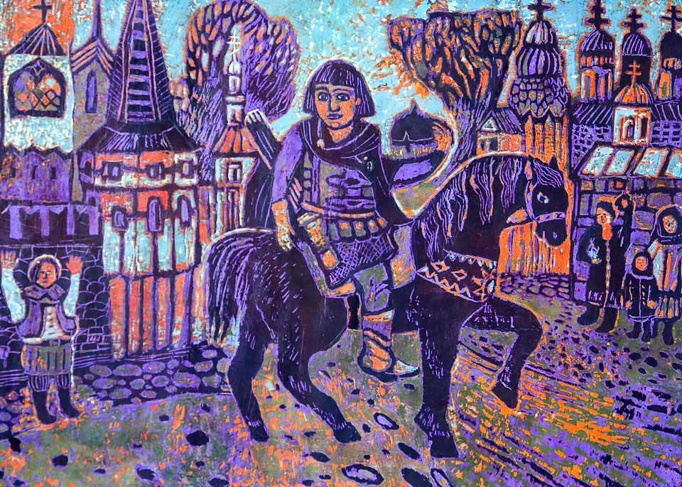 Владимир Болдышкин, 12 лет. Возвращение победителя. Цветная линогравюра. Педагог С.С. Горчакова (ДХШ № 3)