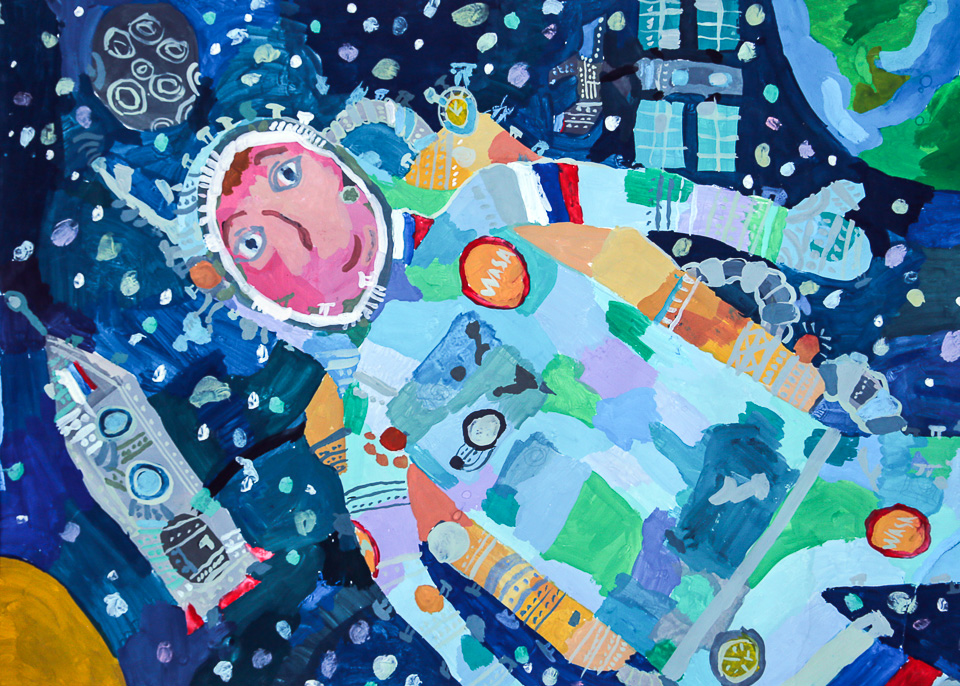 Артем Романец, 12 лет. В открытом космосе. Гуашь. Педагог Ю.А. Алексеева (ДХШ № 3)