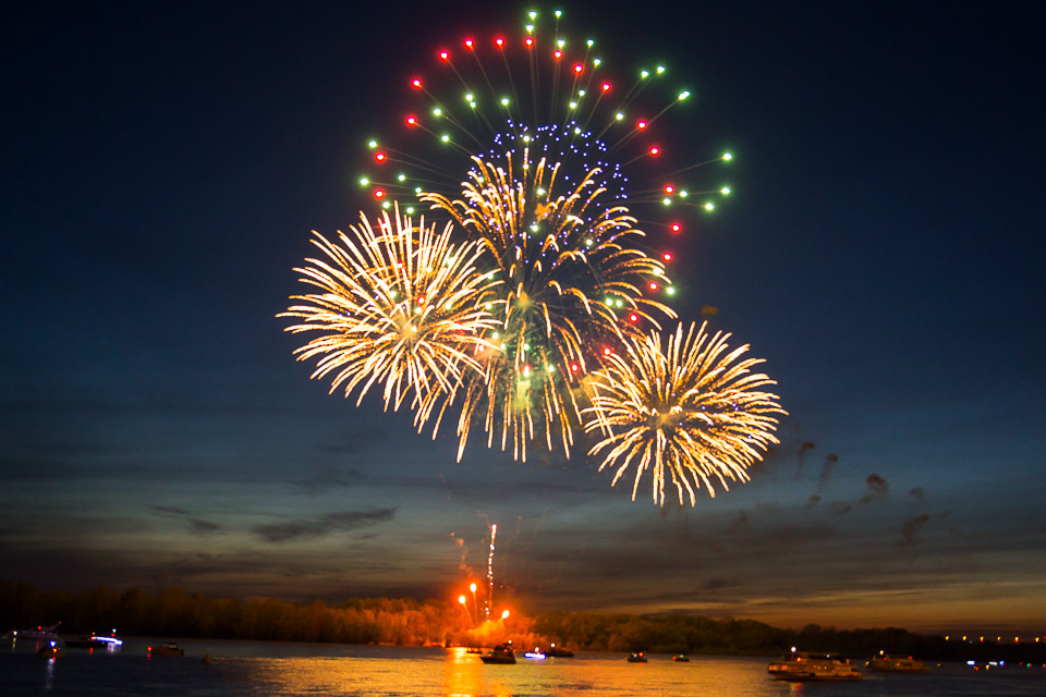 Фейерверк традиционно завершает праздничные мероприятия Дня Победы. Чтобы причудливые узоры в небе увидела вся набережная, пиротехнику устанавливают на острове напротив бульвара Победы.