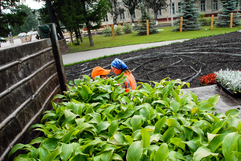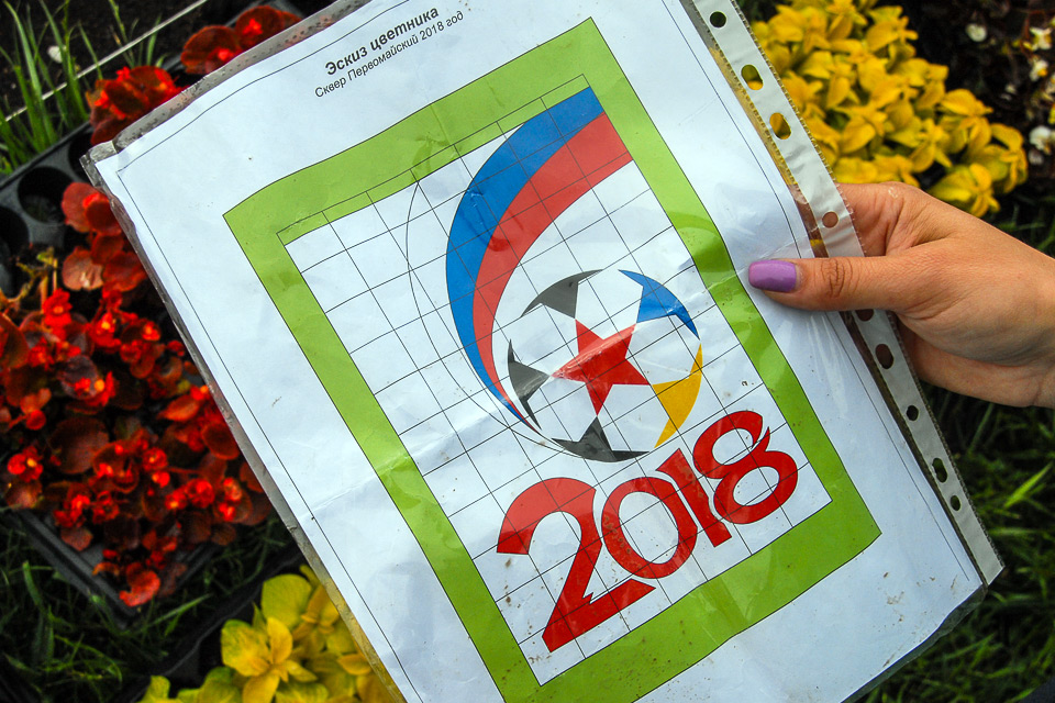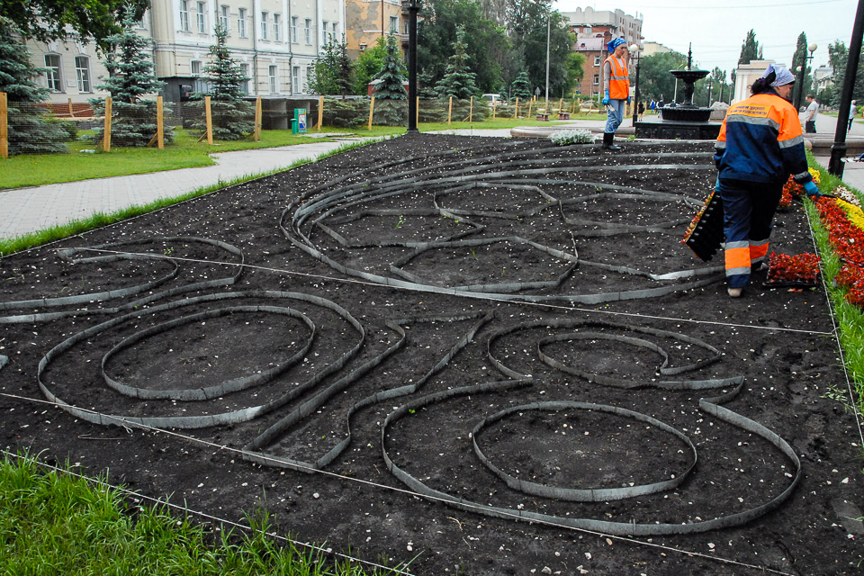 Озеленители создают новую ландшафтную композицию в центре Омска. Она посвящена Чемпионату мира по футболу, который проходит в России в эти дни.