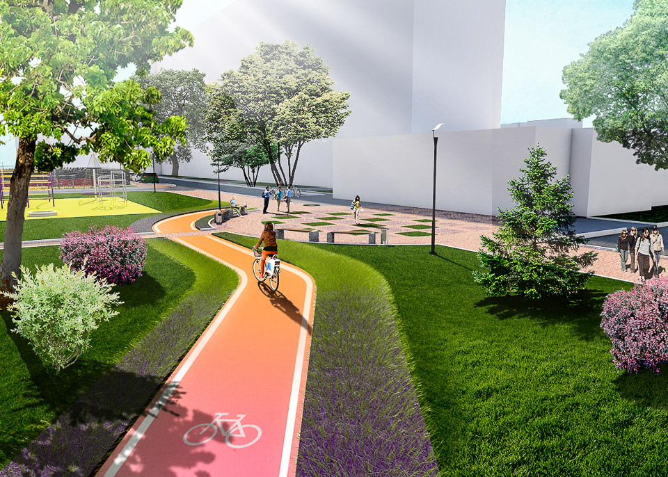 Здесь будет все для тихого отдыха — любимого вида досуга семей с детьми. Пешеходные дорожки, красивые и удобные малые архитектурные формы, необычная длинная скамья-лента и навесы, которые хорошо защитят от солнца в жаркий день, живые изгороди, о которых так долго мечтали местные жители, — конкретные архитектурные решения, предложенные в дизайн-проекте, небанальны и свежи. Учтены существующие пешеходные транзиты. Впрочем, сделано и важное дополнение — предусмотрено создание велодорожки.