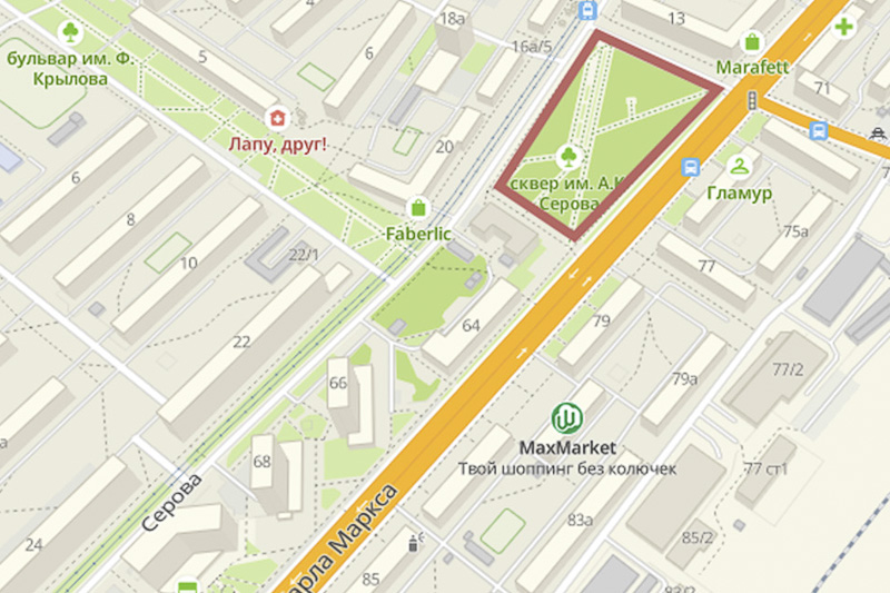 Сквер расположен между проспектом Карла Маркса и улицей Серова, названной так в 1939 году в честь погибшего Героя Советского Союза летчика Анатолия Константиновича Серова. Небольшой, но уютный сквер был благоустроен в 1985 году в канун Всемирного фестиваля молодежи и студентов. Предложенная архитекторами планировка сквера с узловым местом — фонтаном, через которое проходит центральная аллея, сохранилась и сейчас. Сквер украшают цветочные газоны, клумбы с элементами вертикального озеленения, деревья хвойных и лиственных пород: голубые ели, сосны, березы, ивы и липы. Молодожены приезжают сюда, чтобы сфотографироваться у скульптуры «Рождение счастья», мамы гуляют с детьми, а шахматные фестивали, семейные эстафеты и конкурсы собирают вместе жителей всех возрастов. В сквере обновят покрытие дорожек, разобьют цветники, отремонтируют ограждение и подпорную стенку, установят малые архитектурные формы, восстановят освещение.