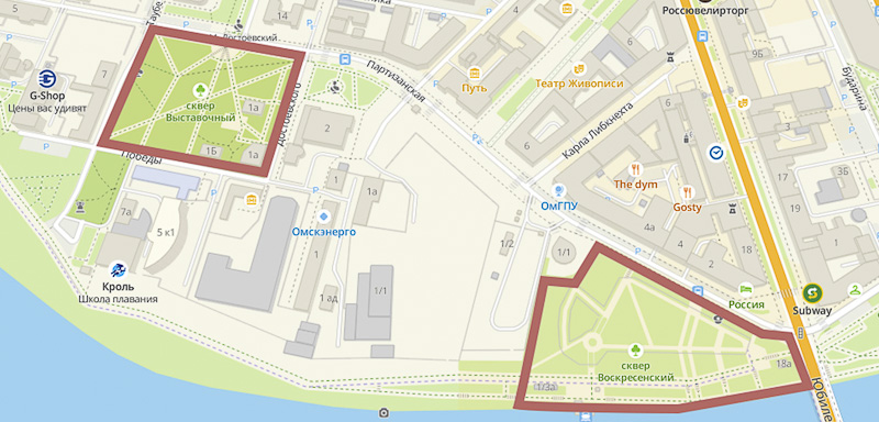 Территория скверов в границах улиц Таубе — Партизанская — Ленина — постоянное место проведения городской выставки «Флора» — гордости омичей. Территория активно используется жителями для транзита и прогулок, она востребована и в будни, и по праздникам. Предлагается обновить это общественное пространство, сделать его привлекательным и комфортным в любое время года. Для этого необходимо заменить покрытие из тротуарной плитки на пешеходных аллеях, решить вопрос с освещением, установить современные малые архитектурные формы и арт-объекты, предусмотреть парковку для велосипедистов.