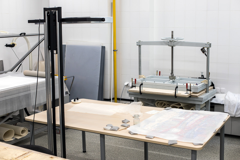 Главный предмет гордости омских реставраторов — вакуумный стол, позволяющий работать даже с предметами, которые сильно деформированы неправильным хранением. Так, уже в ближайшее время омичи увидят отреставрированную картину омского художника, участника Великой Отечественной войны Валентина Кукуйцева «Омск. Первомай» (1971) и восстановленную Генеральную карту Западной Сибири с Киргизской степью, гравированную в Военно-топографическом депо в 1848 году.