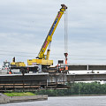 Демонтажные работы начались вчера. За сутки строители разбирают по две балки. Ночью огромные бетонные части перекрытия выпиливают, днём —поднимают с помощью двух кранов, установленных друг напротив друга, переставляют, распиливают мощным алмазным резаком на несколько частей и увозят на свалку. Самая ответственная часть процесса — подъём балок. Здесь всё зависит от мастерства крановщиков. Они должны действовать абсолютно синхронно и максимально аккуратно, чтобы груз не накренился и ни на сантиметр не отклонился от горизонтали. Профессионалы в кабинах тяжёлых подъёмных машин одновременно передвигают рычаги управления с точностью до секунды и градуса. В результате многотонная балка филигранно вынимается из старого пролёта и перекладывается в заданную зону, словно костяшка домино.
