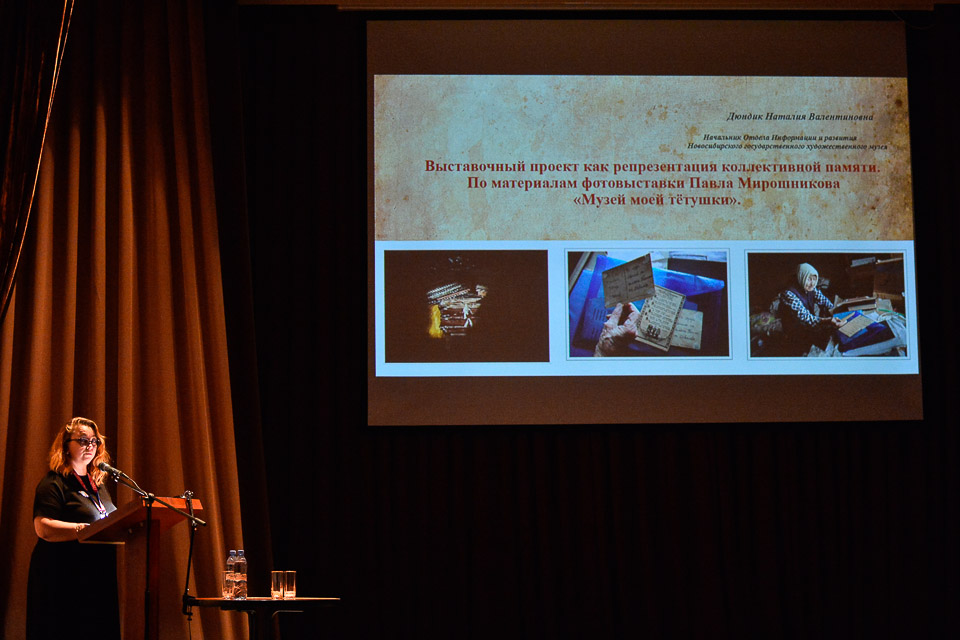Наталья Дюндик, начальник отдела информации и развития НГХМ, выступает с докладом «Выставочный проект как репрезентация коллективной памяти»